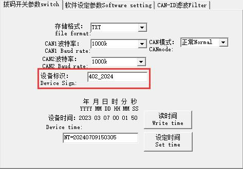 CAN總線數(shù)據(jù)存儲(chǔ)器已經(jīng)集成了系統(tǒng)時(shí)鐘,真實(shí)、準(zhǔn)確的系統(tǒng)時(shí)鐘及文件系統(tǒng)使模塊可以按天存儲(chǔ)并管理數(shù)據(jù),即每天按日期新建文件夾,將當(dāng)天存儲(chǔ)的數(shù)據(jù)自動(dòng)的存入對(duì)應(yīng)的文件夾中。模塊會(huì)在當(dāng)天的文件夾中每分鐘新建一個(gè)文件,將這一分鐘收到的數(shù)據(jù)保存到對(duì)應(yīng)的文件中。如模塊出廠時(shí)間不準(zhǔn)確則需要用戶自行校對(duì)系統(tǒng)時(shí)間,系統(tǒng)時(shí)間界面如圖所示,可以通過點(diǎn)擊讀時(shí)間按鍵,來讀取設(shè)備的系統(tǒng)時(shí)間,修改設(shè)定時(shí)間前的參數(shù)修改為:“NT=XXX”。舉例:發(fā)送“NT=20190626094616”,則會(huì)將系統(tǒng)時(shí)間修改為2019年6月26日09時(shí)46分16秒,點(diǎn)擊設(shè)定時(shí)間。