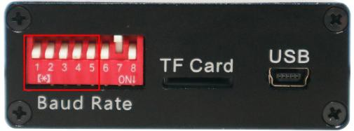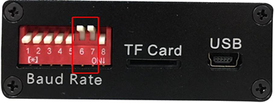 CAN總線數(shù)據(jù)存儲(chǔ)器模塊可以支持20K~1000K之間一組常用的波特率,可以通過操作設(shè)備側(cè)面的撥碼開關(guān),對(duì)波特率進(jìn)行配置,撥碼開關(guān)位置如圖所示。