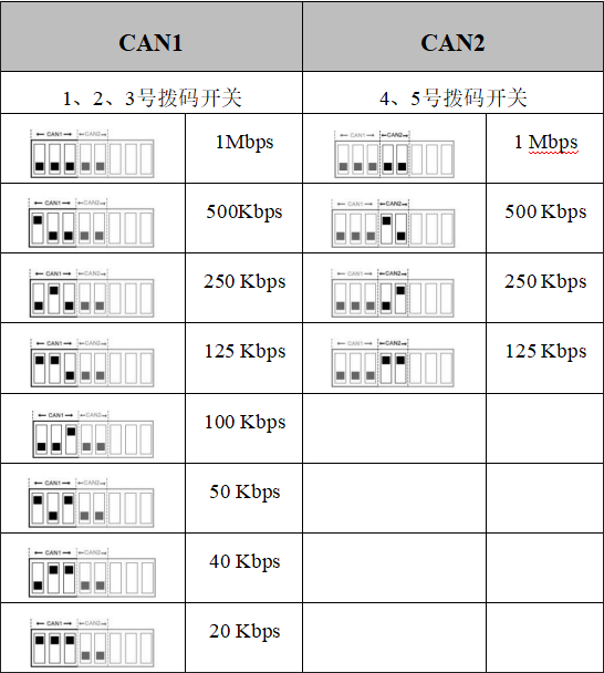 系統(tǒng)先不要上電,撥碼開關(guān)的“1、2、3、4、5”號(hào)可以分別對(duì)CAN1和CAN2波特率進(jìn)行配置,端子8有特殊定義,默認(rèn)朝下,請(qǐng)勿隨意設(shè)置。撥碼開關(guān)向下默認(rèn)為0,向上默認(rèn)為1,具體各波特率說明如表所示。