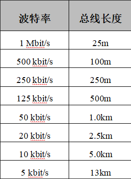 注意:CAN電纜可以使用普通雙絞線、屏蔽雙絞線。理論最大通信距離主要取決于總線波特率,最大總線長度和波特率關(guān)系詳見下表。若通訊距離超過1Km,應(yīng)保證線的截面積大于Φ1.0mm2,具體規(guī)格應(yīng)根據(jù)距離而定,常規(guī)是隨距離的加長而適當(dāng)加大。