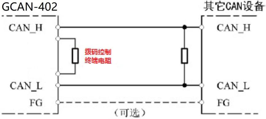 為了增強(qiáng)CAN通訊的可靠性,消除CAN總線終端信號(hào)反射干擾,CAN總線網(wǎng)絡(luò)最遠(yuǎn)的兩個(gè)端點(diǎn)通常要加入終端匹配電阻,如圖所示。終端匹配電阻的值由傳輸電纜的特性阻抗所決定。例如雙絞線的特性阻抗為120Ω,則總線上的兩個(gè)端點(diǎn)也應(yīng)集成120Ω終端電阻。GCAN-402系列模塊CAN通道內(nèi)部已經(jīng)集成標(biāo)準(zhǔn)120Ω終端電阻,可通過撥碼開關(guān)選擇是否將電阻接入總線:1號(hào)開關(guān)控制CAN1對(duì)應(yīng)電阻,2號(hào)開關(guān)控制CAN2對(duì)應(yīng)電阻,撥到ON的位置即可將電阻啟用。