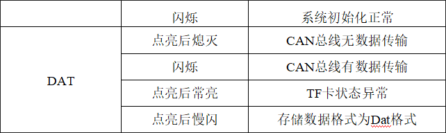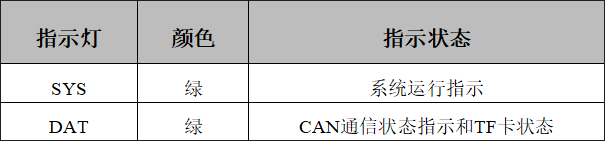 CAN總線數(shù)據(jù)存儲(chǔ)器具有1個(gè)SYS指示燈用來指示系統(tǒng)運(yùn)行狀態(tài),1個(gè)DAT指示燈用來指示CAN總線數(shù)據(jù)傳輸和TF卡狀態(tài)。這2個(gè)指示燈的具體指示功能見下表,這2個(gè)指示燈處于各種狀態(tài)的含義如表所示。