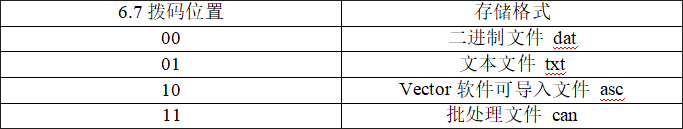 CAN總線數(shù)據(jù)存儲(chǔ)器支持四種保存數(shù)據(jù)格式:二進(jìn)制文件(.DAT)、文本文件(.TXT)、Vector軟件可導(dǎo)入文件(.ASC)、批處理文件(.CAN)可通過8位撥碼開關(guān)中的第六和七個(gè)開關(guān)切換,如圖所示。