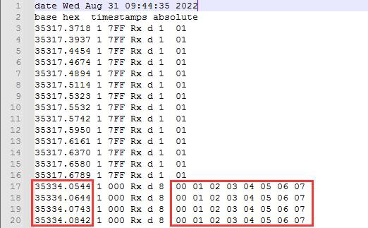 第一列:數(shù)據(jù)時(shí)間(接收數(shù)據(jù)當(dāng)天的絕對(duì)時(shí)間,從零點(diǎn)零分零秒開始計(jì)算,單位:s)例:35334.0544表示當(dāng)天9時(shí)48分54秒第二列:CAN通道,1表示CAN1,2表示CAN2第三列:CAN ID第四列:數(shù)據(jù)類型(默認(rèn)為Rx)第五列:幀類型(d是數(shù)據(jù)幀,r是遠(yuǎn)程幀)第六列:幀數(shù)據(jù)長度第七列之后:幀數(shù)據(jù)