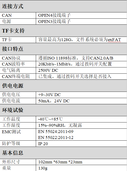 (1)高速的32位工業(yè)級(jí)處理器;(2)使用外接電源供電(DC+9~30V);(3)供電電流:20mA,24V DC;(4)靜電放電抗擾度等級(jí):接觸放電±2KV,空氣放電±15KV;(5)電快速瞬變脈沖群抗擾度等級(jí):±1KV;(6)浪涌抗擾度等級(jí):±1KV;(7)集成2路標(biāo)準(zhǔn)CAN總線接口,使用OPEN4接線端子;(8)CAN總線支持CAN2.0A、CAN2.0B幀格式,符合ISO/DIS 11898標(biāo)準(zhǔn);(9)CAN總線通訊波特率在10Kbps~1Mbps之間可通過撥碼開關(guān)配置;(10)CAN總線接口采用電氣隔離,隔離模塊絕緣電壓:DC 2500V;(11)最高接收數(shù)據(jù)流量:2000 fps/秒;(12)CAN數(shù)據(jù)帶有時(shí)間戳,精度0.1ms;(13)工作溫度范圍:-40℃~+85℃;(14)工作濕度范圍:5%~95%RH無凝露;(15)存儲(chǔ)卡最大支持128G;