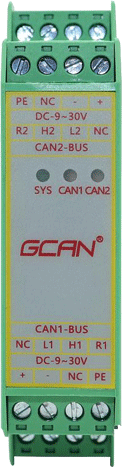 GCAN-226模塊集成2路DC 9-30V電源接口、2路標(biāo)準(zhǔn)CAN總線接口,CAN總線自帶120Ω終端電阻,可通過(guò)連線接入。GCAN-226模塊接線端子如圖所示。