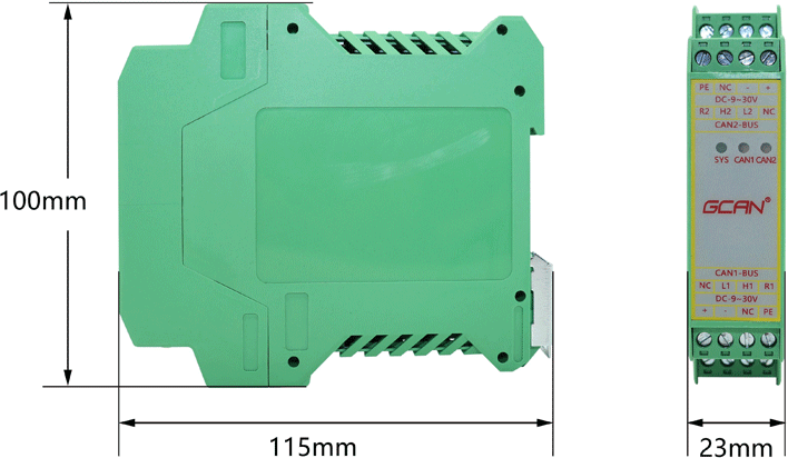 設(shè)備外形尺寸:(長(zhǎng),含接線端子)115mm*(寬)23mm*(高)100mm,其示意圖如圖所示。