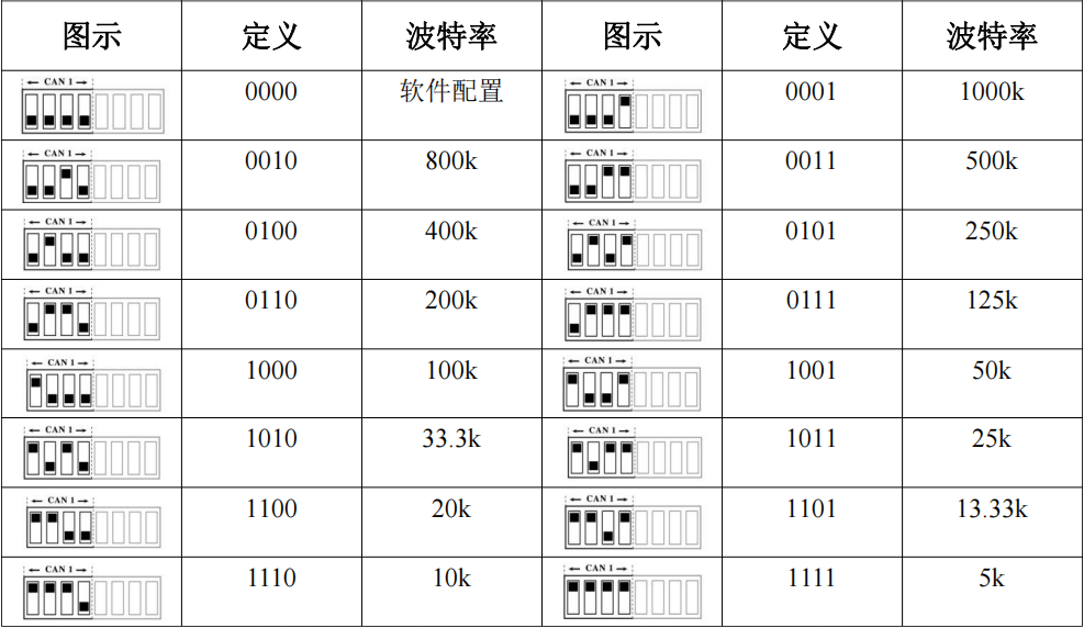 2、通過(guò)撥碼開(kāi)關(guān)配置CAN總線波特率