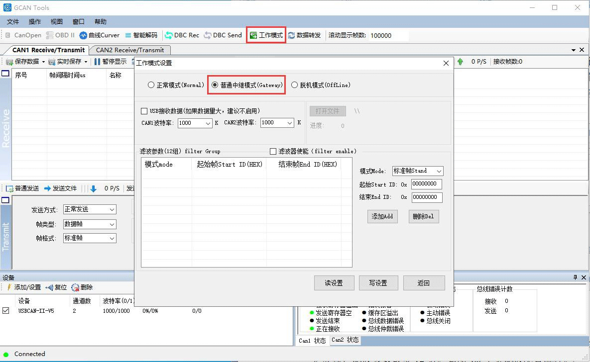 CAN中繼功能可將2條波特率相同或不同的CAN總線數(shù)據(jù)進(jìn)行相互轉(zhuǎn)發(fā)。您可通過(guò)點(diǎn)選“工作模式”——“普通中繼模式”——“設(shè)置CAN1和CAN2的波特率”——“寫(xiě)設(shè)置”來(lái)設(shè)置GCAN-226的工作模式。操作流程如圖所示。