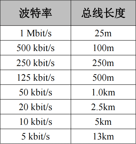 請(qǐng)注意:CAN總線電纜可以使用普通雙絞線、屏蔽雙絞線。理論最大通信距離主要取決于總線波特率,最大總線長(zhǎng)度和波特率關(guān)系詳見(jiàn)表。若通訊距離超過(guò)1Km,應(yīng)保證線的截面積大于Φ1.0mm2,具體規(guī)格應(yīng)根據(jù)距離而定,常規(guī)是隨距離的加長(zhǎng)而適當(dāng)加大。