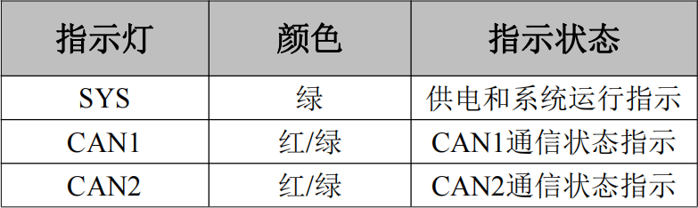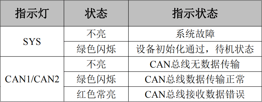 GCAN-226系列模塊具有1個(gè)PWR指示燈用來(lái)情況,1個(gè)SYS指示燈用來(lái)指示系統(tǒng)供電和系統(tǒng)的運(yùn)行狀態(tài),2個(gè)CAN指示燈用來(lái)指示CAN總線數(shù)據(jù)傳輸。這3個(gè)指示燈的具體指示功能見(jiàn)下表,這3個(gè)指示燈處于各種狀態(tài)的含義如表所示。