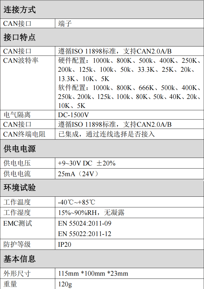 (1)PC接口符合USB2.0全速規(guī)范,兼容USB1.1及USB3.0;(2)集成2路CAN總線接口,使用鳳凰端子接線方式;(3)支持CAN2.0A和CAN2.0B幀格式,符合ISO/DIS 11898規(guī)范;(4)CAN總線通訊波特率在5kps~1Mbps之間任意可編程;(5)CAN總線自帶120Ω終端電阻,可通過(guò)連線接入;(6)CAN總線接口采用電氣隔離,隔離模塊絕緣電壓:DC 1500V;(7)總線自動(dòng)復(fù)位;(8)使用外接電源(DC 9-30V);(9)供電電流:25mA;(10)最高接收數(shù)據(jù)流量:14000 fps;(11)工作溫度范圍:-40℃~+85℃;