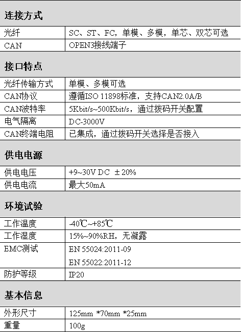 (1)使用外接電源供電(DC+9~30V±5%);(2)工作溫度范圍:-40℃~+85℃;(3)工作濕度范圍:15%~95%RH無(wú)凝露;(4)集成1路CAN總線接口,使用端子接線方式;(5)CAN總線信號(hào)包括:CAN_H、CAN_L、EARTH;(6)CAN總線自帶120Ω終端電阻,可通過(guò)撥碼開關(guān)選擇;(7)CAN總線支持CAN2.0A和CAN2.0B幀格式,符合ISO/DIS 11898規(guī)范;(8)CAN總線通訊波特率在5Kbps~500Kbps之間可通信;(9)CAN總線接口采用電氣隔離,隔離模塊絕緣電壓:DC 3000V;(10)光纖接口SC、ST、FC可選;(11)光纖傳輸模式單模、多??蛇x;(12)光纖數(shù)量單芯、雙芯可選。1、208-1接線