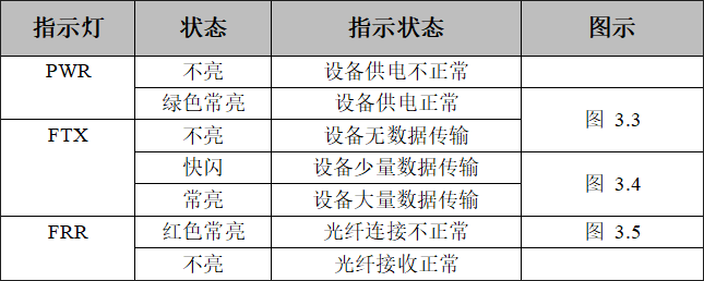 GCAN-208-S系列模塊具有1個(gè)PWR指示燈用來(lái)指示系統(tǒng)供電情況,1個(gè)FTX指示燈用來(lái)指示光纖數(shù)據(jù)傳輸,1個(gè)TX指示燈用來(lái)指示總線數(shù)據(jù)錯(cuò)誤。這5個(gè)指示燈的具體指示功能見(jiàn)下表,這5個(gè)指示燈處于各種狀態(tài)的含義如表所示。