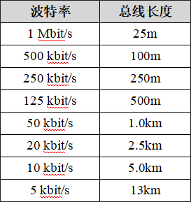 波特率與最大總線長(zhǎng)度參照表