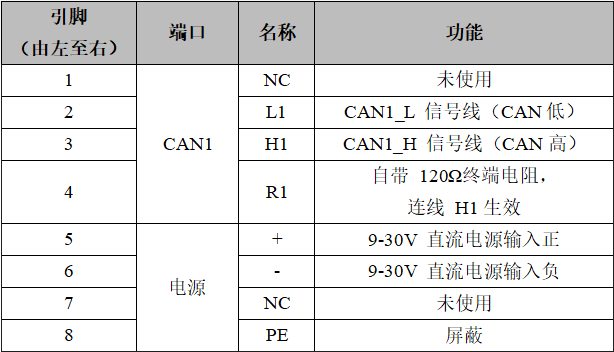 GCAN-212-B模塊的下方為CAN1接口和電源接口。電源接口由1個(gè)4 PIN插拔式接線端子引出(綠色),CAN1總線接口由一個(gè)4 PIN插拔式接線端子引出(綠色)。電源接口及CAN1總線接口位置、接口定義如圖所示。