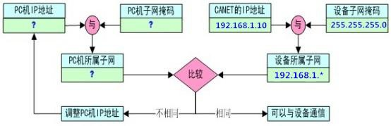 GCAN-212-B設(shè)備在出廠時(shí)設(shè)定了一個(gè)默認(rèn)的IP地址(192.168.1.10)和網(wǎng)關(guān)(255.255.255.0),用戶(hù)可以按圖所示的流程檢查該設(shè)備是否和用戶(hù)PC機(jī)在同一網(wǎng)段。