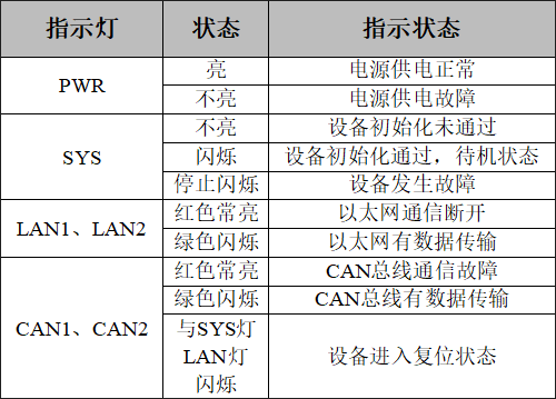 廣成科技GCAN-212-B接口卡具有1個(gè)PWR指示燈、1個(gè)SYS指示燈,用來(lái)指示設(shè)備的運(yùn)行狀態(tài),2個(gè)LAN指示燈、2個(gè)CAN指示燈,用來(lái)指示對(duì)應(yīng)總線狀態(tài)。這6個(gè)指示燈的具體指示功能見(jiàn)下表,這5個(gè)指示燈處于不同狀態(tài)時(shí),GCAN-212-B的狀態(tài)如下表所示。