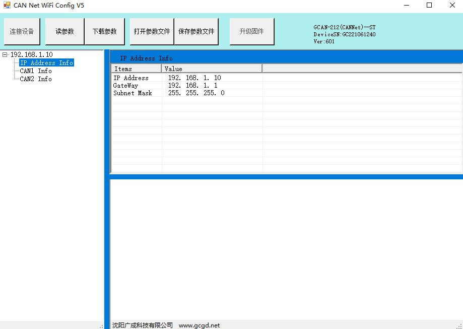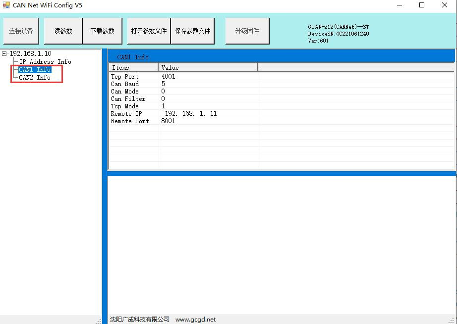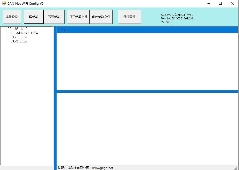 廣成科技GCAN-212-B配置界面軟件上方有6個(gè)工具按鈕:“連接設(shè)備”——連接設(shè)備;“讀參數(shù)”——將設(shè)備中的配置信息讀出來(lái);“下載參數(shù)”——將配置信息下載到設(shè)備的Flash中;“打開(kāi)參數(shù)文件”——打開(kāi)讀取PC中的配置信息文件;“保存參數(shù)文件”——將配置信息文件保存到電腦中;“升級(jí)固件”——升級(jí)GCAN-212-B(CANet)固件內(nèi)核。(此功能請(qǐng)?jiān)谥笇?dǎo)下使用)