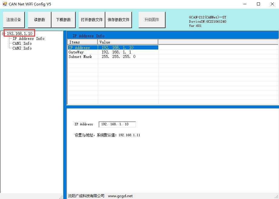 其中:(修改參數(shù)時(shí),點(diǎn)擊后在下方修改,修改后變紅為正?,F(xiàn)象)“IP Address Info”——以太網(wǎng)端參數(shù)設(shè)置;“CAN1/CAN2 Info”——CAN總線參數(shù)設(shè)置。