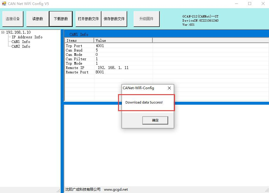 當(dāng)用戶(hù)對(duì)某一參數(shù)進(jìn)行修改后,該部分將在軟件中變成紅色。當(dāng)用戶(hù)配置完成后點(diǎn)擊“下載參數(shù)”即可將配置信息下載到GCAN-212-B的Flash中。
