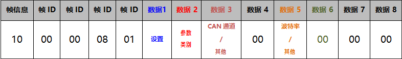 (1)波特率:數(shù)據(jù)1,數(shù)據(jù)2:02 01表示設(shè)置波特率;0B 03表示CAN1-CAN2復(fù)位。數(shù)據(jù)3:01表示CAN1通道;02表示CAN2通道。數(shù)據(jù)5:00=1000K,01=840k,02=700K,03=500K,04=400K,05=250K,06=200K,07=125K,08=100K,09=80K,10=50K,11=40K,12=20K,13=10K,14=5K
