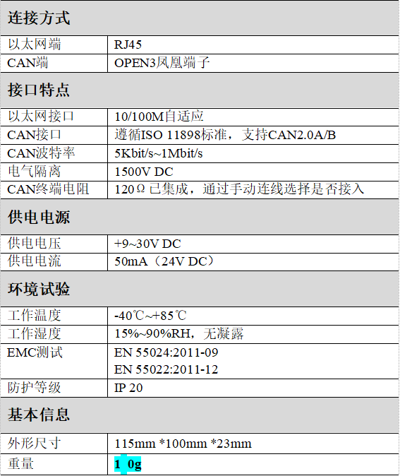 (1)高速的32位工業(yè)級(jí)處理器;(2)內(nèi)嵌硬件看門(mén)狗定時(shí)器;(3)模塊內(nèi)置FLASH儲(chǔ)存器,可儲(chǔ)存參數(shù);(4)使用外接電源供電(DC+9~24V)(5)供電電流:50mA(24V DC);(6)靜電放電抗擾度等級(jí):接觸放電±2KV,空氣放電±15KV;(7)電快速瞬變脈沖群抗擾度等級(jí):±1KV;(8)浪涌抗擾度等級(jí):±1KV;(9)工作溫度范圍:-40℃~+85℃;(10)工作濕度范圍:5%~95%RH無(wú)凝露;(11)螺絲固定的安裝方式,專(zhuān)為工業(yè)設(shè)計(jì)。(12)集成2路CAN-bus接口,采用鳳凰端子接線方式;(13)CAN-bus信號(hào)包括:CAN_H、CAN_L、CAN_GND;(14)CAN-bus支持CAN2.0A和CAN2.0B幀格式,符合ISO/DIS 11898規(guī)范;(15)CAN-bus通訊波特率在5Kbps~1Mbps之間任意可編程;(16)CAN-bus接口采用電氣隔離,隔離模塊絕緣電壓:DC 1500V;(17)32個(gè)硬件FIFO接收緩沖器,最高發(fā)送數(shù)據(jù)流量:8000幀/秒;最高接收數(shù)據(jù)流量:14000幀/秒;(18)CAN端接收?qǐng)?bào)文時(shí)間戳精度可達(dá)1us。(19)使用標(biāo)準(zhǔn)以太網(wǎng)接口,RJ45,支持10/100M自適應(yīng);(20)支持心跳和超時(shí)斷開(kāi)功能;(21)工作端口、目標(biāo)IP和目標(biāo)端口均可設(shè)定;(22)網(wǎng)絡(luò)斷開(kāi)后自動(dòng)恢復(fù)連接資源,可靠地建立TCP連接;(23)兼容SOCKET工作方式(TCP Server、TCP Client、UDP等),上位機(jī)通訊軟件編寫(xiě)遵從標(biāo)準(zhǔn)的SOCKET規(guī)則。