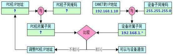 GCAN-212-W設(shè)備在出廠時(shí)設(shè)定了一個(gè)默認(rèn)的IP地址(192.168.1.10)和網(wǎng)關(guān)(255.255.255.0),用戶可以按圖3.2所示的流程檢查該設(shè)備是否和用戶PC機(jī)在同一網(wǎng)段。