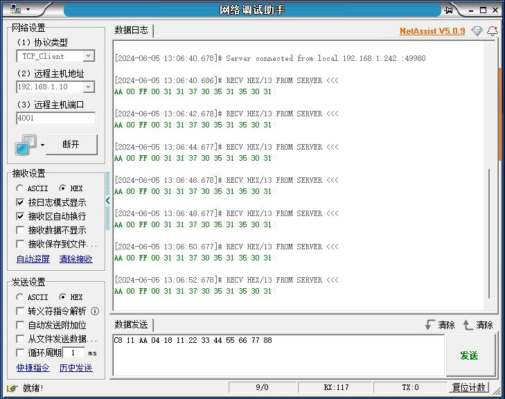 當(dāng)廣成科技GCAN-212-W設(shè)備選擇TCP Server模式,并通過(guò)以太網(wǎng)成功連接PC機(jī)時(shí),若某路CAN通道沒(méi)有CAN數(shù)據(jù)傳輸,那么網(wǎng)絡(luò)調(diào)試助手的接收窗口將顯示一條ASCII碼數(shù)據(jù)狀態(tài)報(bào)文,舉例為“AA 00 FF 00 31 32 31 30 36 31 32 34 30”,此心跳報(bào)文第五字節(jié)表示的是通道號(hào)31表示的是CAN1通道,32表示的為CAN2通道。最后8個(gè)字節(jié)分別表示的是設(shè)備的SN號(hào),由于此設(shè)備開(kāi)頭SN號(hào)始終為2,所以只顯示后8位,SN號(hào)即為221061240.此報(bào)文為13個(gè)字節(jié),發(fā)送時(shí)間間隔為2秒鐘。