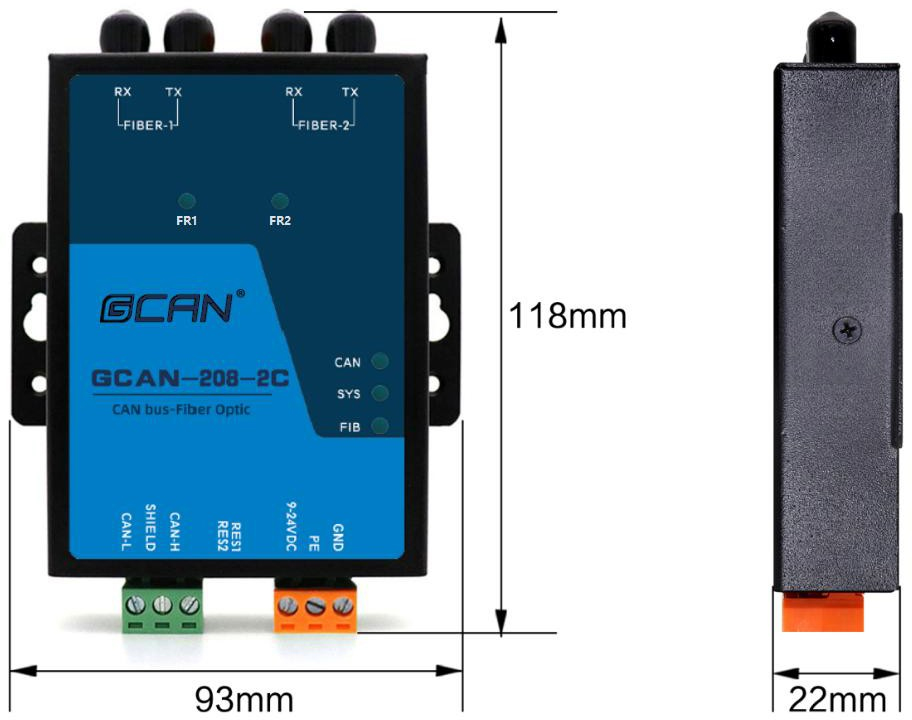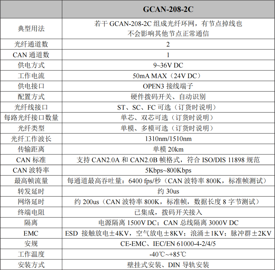GCAN-208-2C模塊集成一路9-36V DC電源接口、1路標(biāo)準(zhǔn)CAN總線接口及2路標(biāo)準(zhǔn)光纖接口(單模、多模,SC、ST、FC可選)。