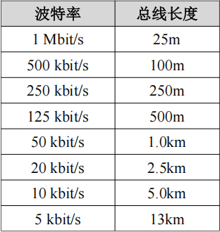 請(qǐng)注意:CAN總線電纜可以使用普通雙絞線、屏蔽雙絞線。理論最大通信距離主要取決于總線波特率,最大總線長(zhǎng)度和波特率關(guān)系詳見(jiàn)表3.2。若通訊距離超過(guò)1Km,應(yīng)保證線的截面積大于Φ1.0mm2,具體規(guī)格應(yīng)根據(jù)距離而定,常規(guī)是隨距離的加長(zhǎng)而適當(dāng)加大。