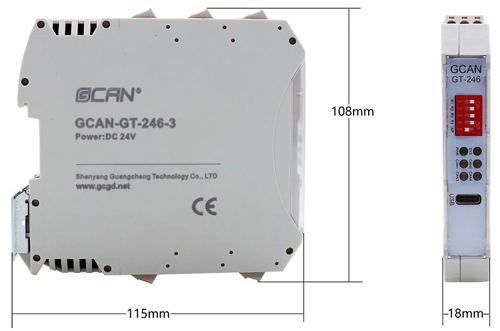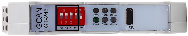 GCAN-GT-246模塊具有1個(gè)PWR指示燈、1個(gè)SYS指示燈、4個(gè)CAN總線狀態(tài)指示燈。
