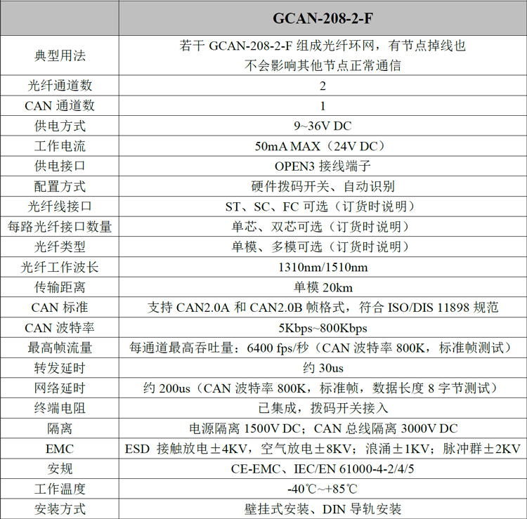 2)GCAN-208-2-F系列光纖支持CAN總線網(wǎng)絡(luò)的中繼擴(kuò)容,傳輸距離20km;支持不同波特率的CAN總線網(wǎng)絡(luò),CAN波特率支持5Kbps~800Kbps;支持CANopen、SAE J1939、DeviceNet、NMEA2000等任何CAN總線通信協(xié)議。