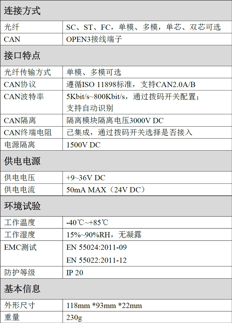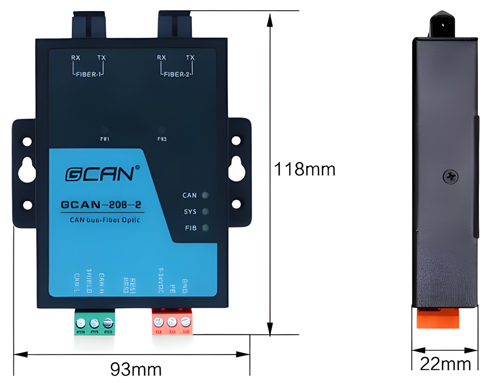 GCAN-208-2-F模塊集成一路9-36V DC電源接口、1路標(biāo)準(zhǔn)CAN總線接口及2路標(biāo)準(zhǔn)光纖接口(單模、多模,SC、ST、FC可選)。