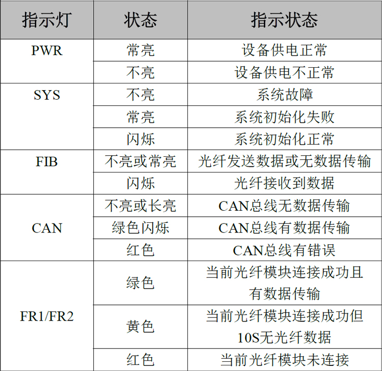 光纖與CAN均連接正常后,當(dāng)有數(shù)據(jù)在CAN與光纖之間傳輸時(shí),相應(yīng)的FIB、CAN指示燈會(huì)閃爍。