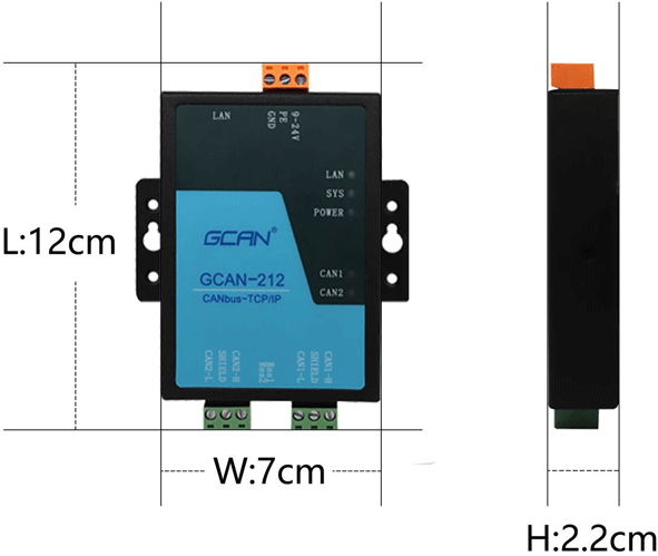 設(shè)備外形尺寸:(長,含接線端子)12cm*(寬)7cm*(高)2.2cm,其示意圖如下圖所示,用戶可根據(jù)此尺寸設(shè)計(jì)GCAN-212的安裝固定孔。