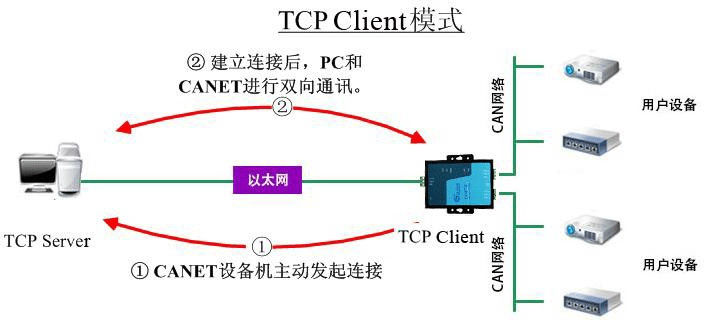 廣成科技GCAN-212接口卡的以太網(wǎng)接口符合以太網(wǎng)標(biāo)準(zhǔn)協(xié)議規(guī)范,設(shè)備集成10/100M自適應(yīng)以太網(wǎng)芯片,支持即插即用。用戶可以使用標(biāo)準(zhǔn)以太網(wǎng)網(wǎng)線將工業(yè)以太網(wǎng)與GCAN-212連接。GCAN-212支持3種工作模式——TCP Server模式、TCP Client模式、UDP模式。這3種工作模式的介紹詳情如下: