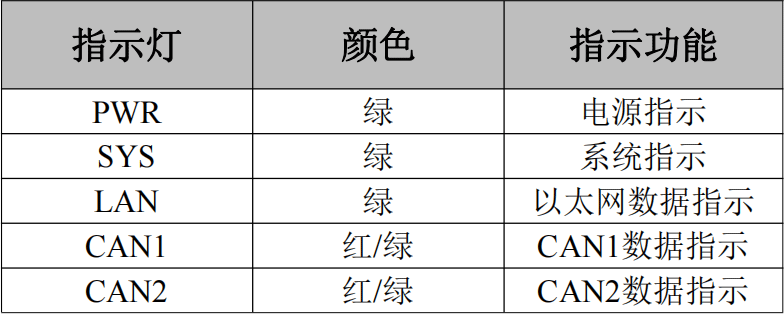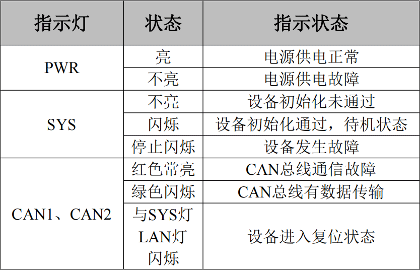 廣成科技GCAN-212接口卡具有1個(gè)PWR指示燈、1個(gè)SYS指示燈,用來指示設(shè)備的運(yùn)行狀態(tài),1個(gè)LAN指示燈、1個(gè)CAN1指示燈和1個(gè)CAN2指示燈,用來指示總線狀態(tài)。這5個(gè)指示燈的具體指示功能見下表,這5個(gè)指示燈處于不同狀態(tài)時(shí),GCAN-212的狀態(tài)如下表所示。