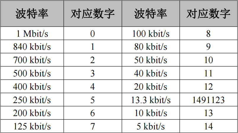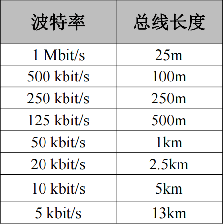 注意:CAN-bus電纜可以使用普通雙絞線、屏蔽雙絞線。理論最大通信距離主要取決于總線波特率,最大總線長度和波特率關(guān)系詳見下表。若通訊距離超過1Km,應(yīng)保證線的截面積大于Φ1.0mm2,具體規(guī)格應(yīng)根據(jù)距離而定,常規(guī)是隨距離的加長而適當(dāng)加大。