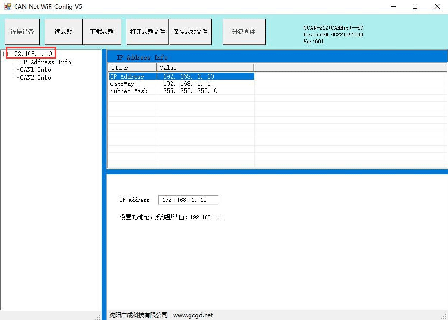 設(shè)備使用前需要進(jìn)行參數(shù)配置。GCAN-212設(shè)備配置時(shí)只需連接電源并將以太網(wǎng)口連接至電腦即可。打開CANet-Wifi-Config-V5軟件,設(shè)備類型選擇GCAN-212(CANNet),IP地址輸入GCAN-212的IP地址(默認(rèn)IP:192.168.1.10)。