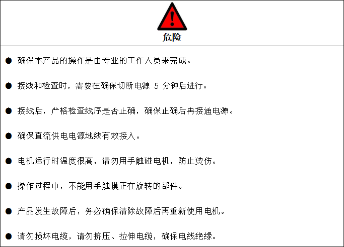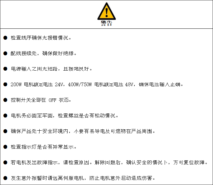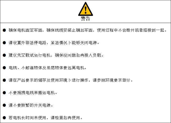 建議電機(jī)先進(jìn)行空載操作,試轉(zhuǎn)沒問題后,再加入負(fù)載進(jìn)行操作,若試轉(zhuǎn)過程中,電機(jī)噪音過大,抖動(dòng)過大,或者有任何報(bào)警情況,請與廠家聯(lián)系。