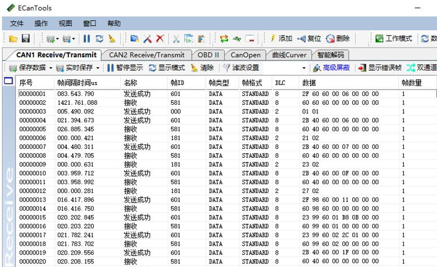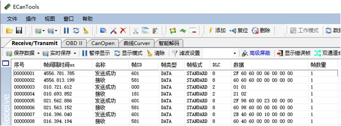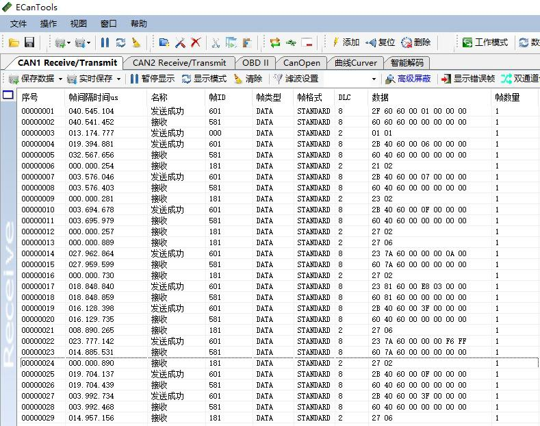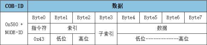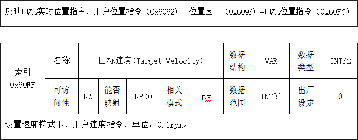 報(bào)文:ID:0x601數(shù)據(jù):23 FF 60 00 E8 03 00 00,單位0.1rpm,即轉(zhuǎn)速為1000*0.1rpm。