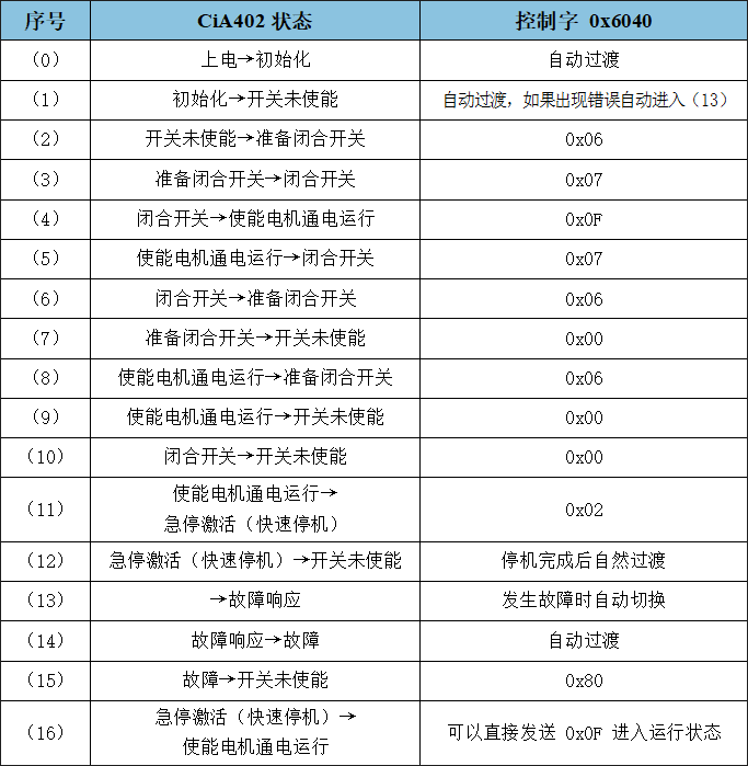 報(bào)文:ID:0x601數(shù)據(jù):2B 40 60 00 06 00 00 00,設(shè)置伺服狀態(tài)切換到ready to switch on狀態(tài)。