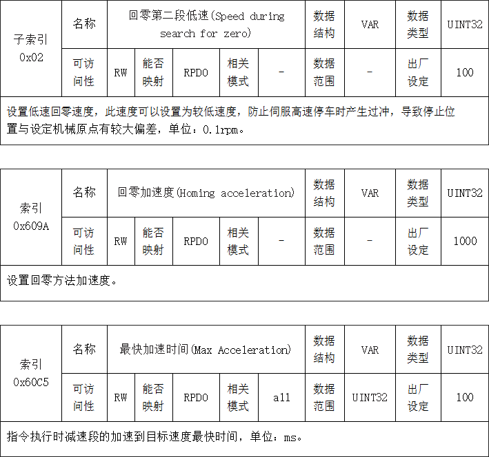 報(bào)文:ID:0x601數(shù)據(jù):23 99 60 02 2C 01 00 00,設(shè)置伺服回零第二段低速為300*0.1rpm。