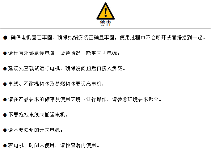 建議電機(jī)先進(jìn)行空載操作,試轉(zhuǎn)沒問題后,再加入負(fù)載進(jìn)行操作,若試轉(zhuǎn)過程中,電機(jī)噪音過大,抖動(dòng)過大,或者有任何報(bào)警情況,請(qǐng)與廠家聯(lián)系。