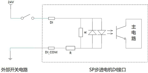 電源24V正極接開關(guān)一端,開關(guān)的另一端與SP步進(jìn)電機(jī)的DI相連,對(duì)應(yīng)的DI_COM與電源負(fù)極相連。各DI接線功能如下: