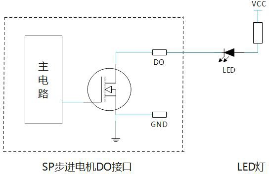 電源VCC正極接限流電阻后與LED燈正極相連,SP步進(jìn)電機(jī)的DO接LED燈的負(fù)極,對(duì)應(yīng)的GND與電源負(fù)極相連。對(duì)應(yīng)的LED燈可展示SP步進(jìn)電機(jī)的運(yùn)行狀態(tài)等,本功能待后續(xù)開發(fā)更新。