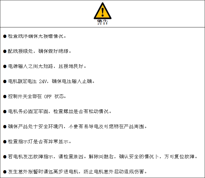 請(qǐng)按照下表逐一檢查,以防止操作不當(dāng)造成產(chǎn)品及人員的損傷。