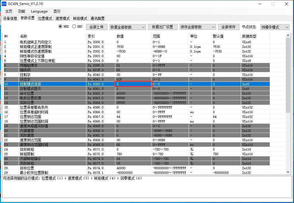 1、設(shè)置控制模式為轉(zhuǎn)矩模式:索引Pn 6060.0輸入04。