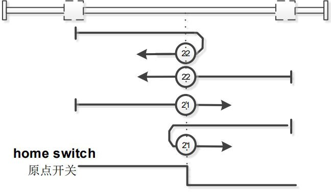 B:啟動(dòng)時(shí)原點(diǎn)開關(guān)信號(hào)無效時(shí):驅(qū)動(dòng)器首先以0x6099.2的低速向負(fù)方向移動(dòng),遇到負(fù)限位開關(guān),驅(qū)動(dòng)器以0x6099.1的高速向正方向移動(dòng),遇到原點(diǎn)開關(guān)信號(hào)變?yōu)橛行r(shí)(沿變化),0x6099.2的低速向負(fù)方向移動(dòng),遇到原點(diǎn)開關(guān)信號(hào)變?yōu)闊o效時(shí)(沿變化)停止;